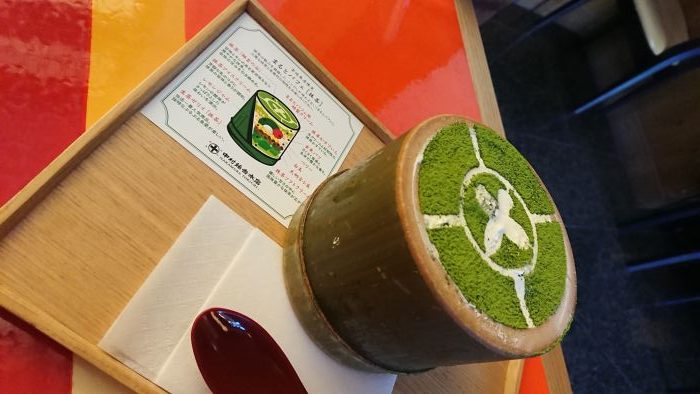 竹筒に収められたパフェには生茶ゼリーや抹茶カステラ、
