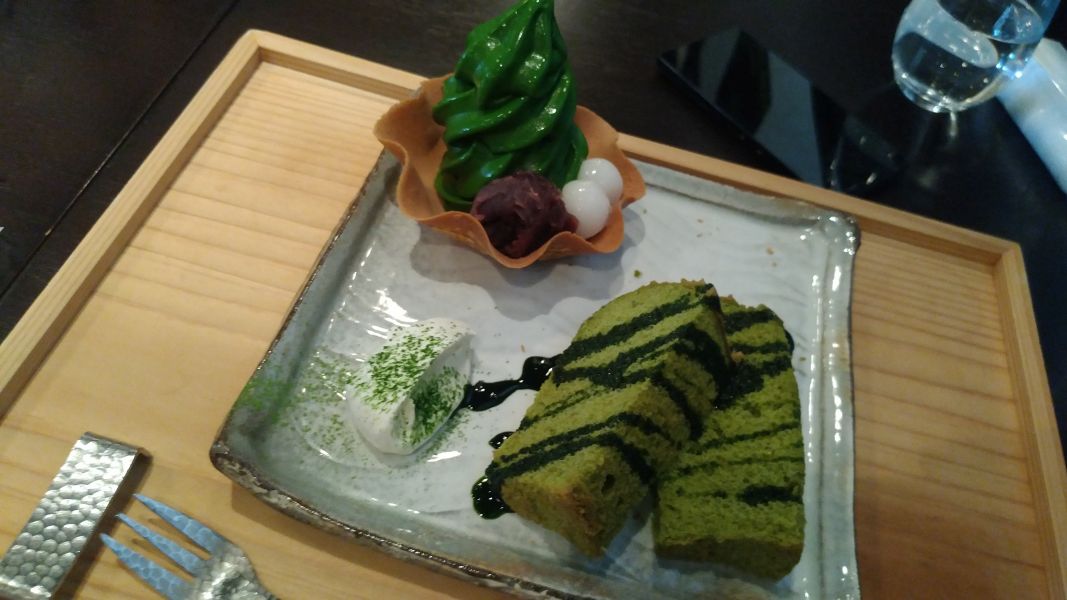 抹茶ソフトの濃さを、ケーキとホイップクリームの甘味とあわせ戴く。