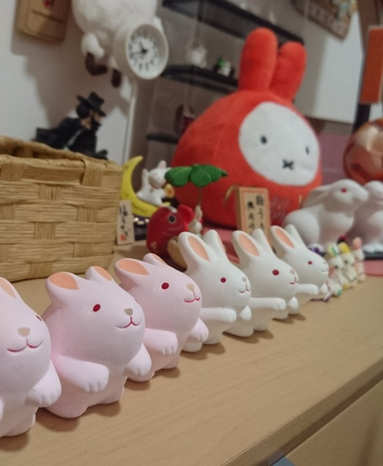 本殿の前には容器を持ち帰らず奉納されて無数のミニうさぎが並んでいてかわいいです