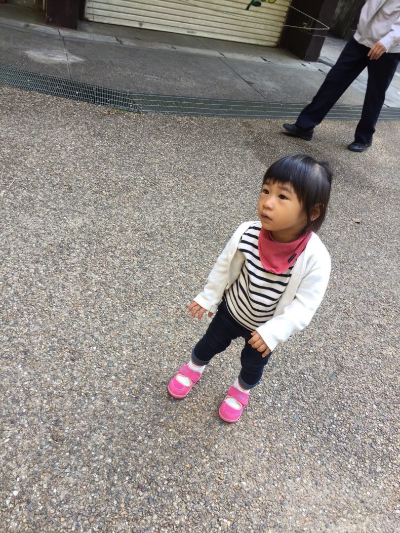 でかい滝を初めて見る娘もこのおよび腰です。