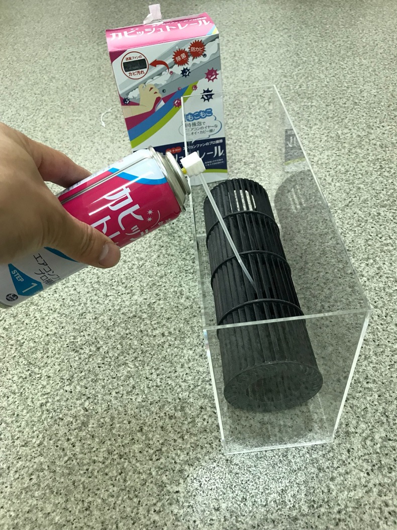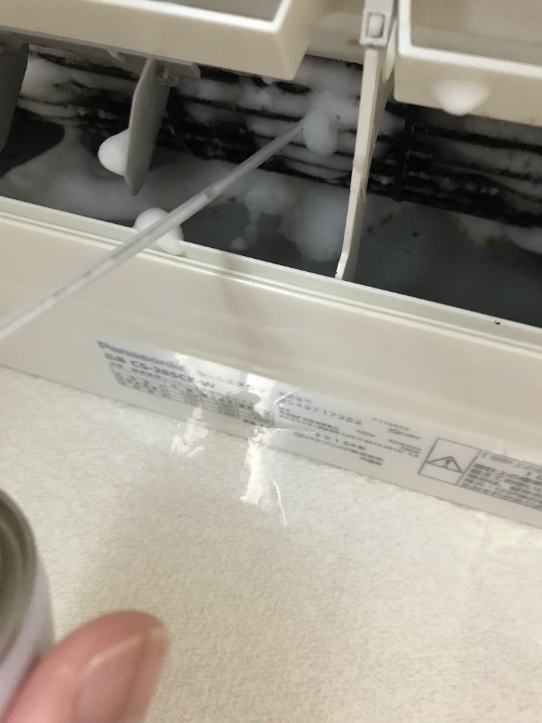 養生が完了すれば早速エアコンの口からスプレー缶①の泡状の洗浄液を中のローラー?部分に吹き付けます!