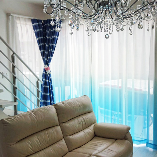 手染めで表情のある藍染カーテンと継ぎ目の出ないグラデーションレースカーテン。