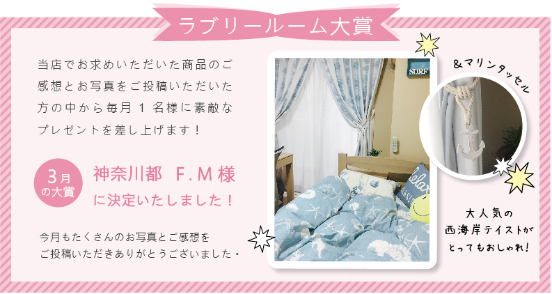 びっくりカーテンでは商品をお求めいただきましたお客様を対象にお部屋のお写真とご感想を募集いたしております。