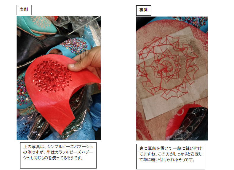その「甲のパーツ」は、ビーズを1つ1つ手作業で、家事の合間に縫い付け作業をする熟練した女性職人さんたちへと運ばれます。