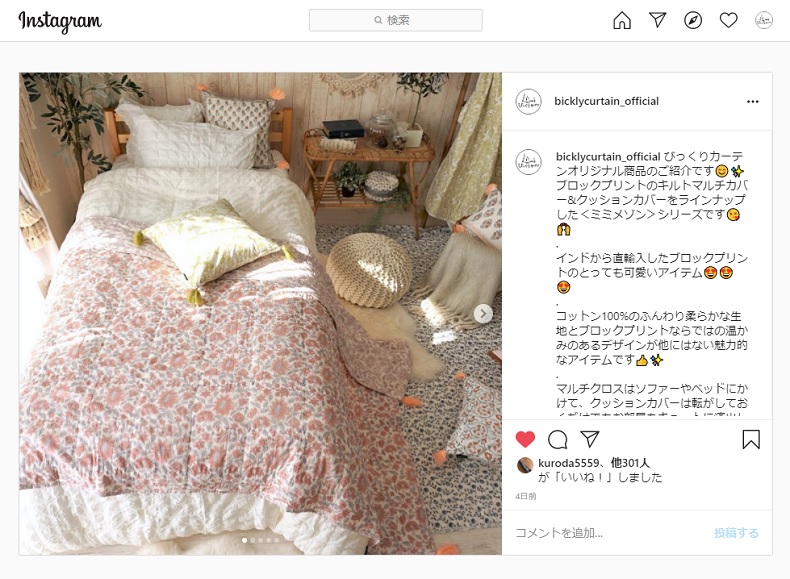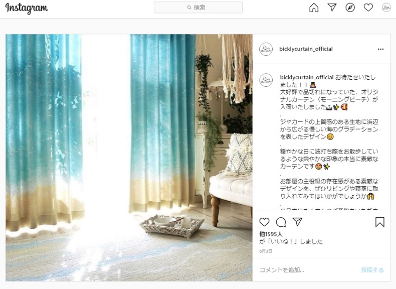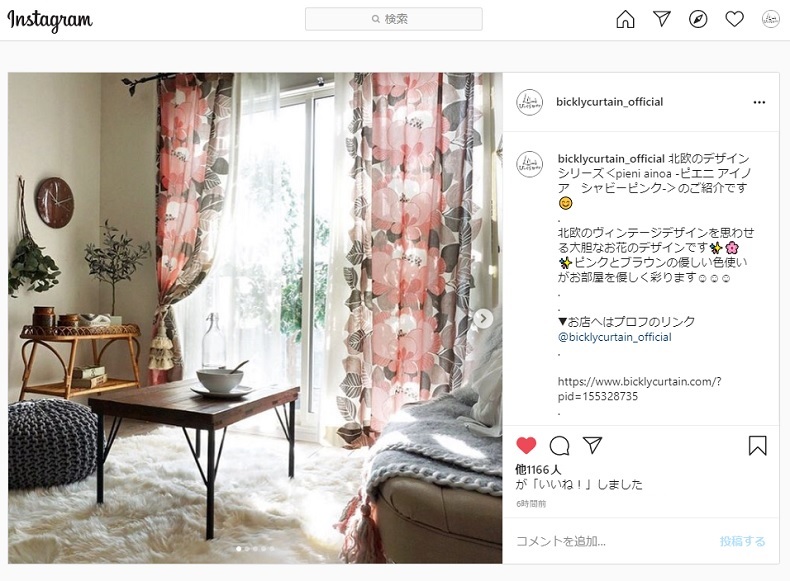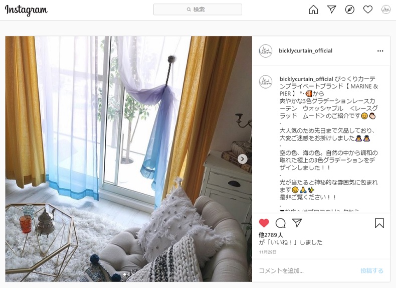 気に入ったらそのまますべてのアイテムを購入して、見たままのお部屋を再現できるところも、びっくりカーテンのインスタグラムの良いところなのです。