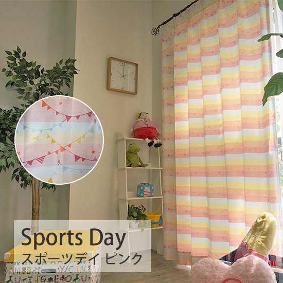 ■商品名 形状記憶・運動会の旗のような楽しいデザインがモチーフの非遮光カーテン<スポーツデイ ピンク>※2020年7月販売終了。
