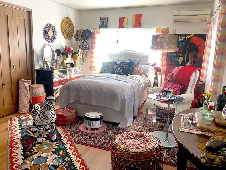 こだわりのコーディネートが素敵なベッドルームには可愛いピンクのカーテンと優しいボイルカーテン