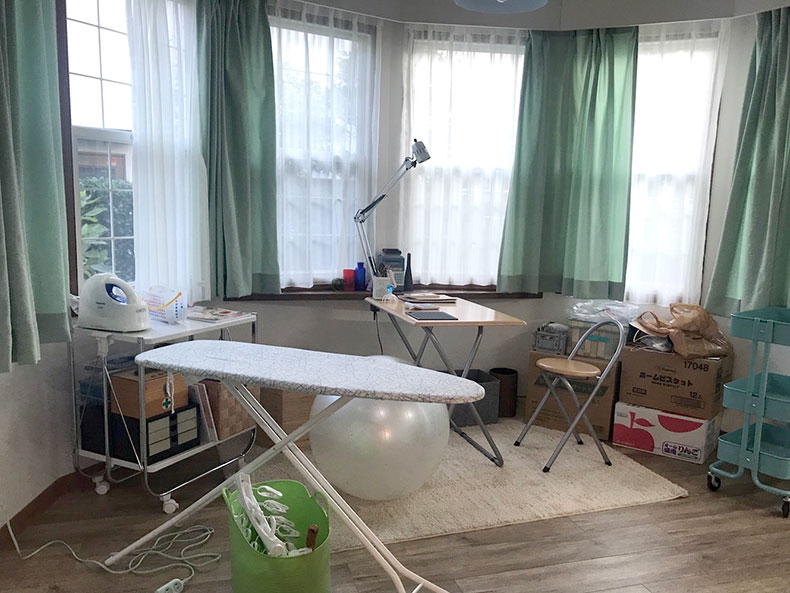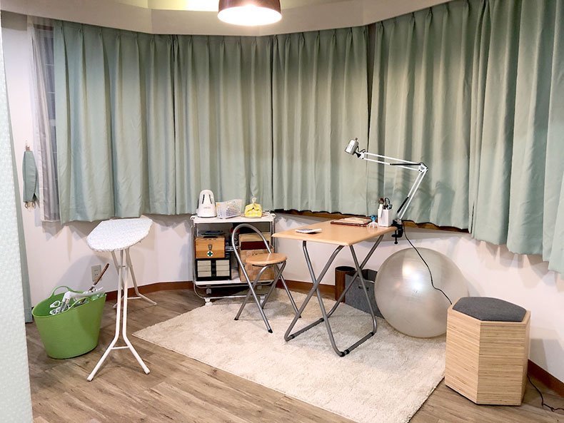 ▼使い勝手の良さそうな家事室には、優しいカラーの非遮光カーテン【ユーカラー】の<グリーン>>。