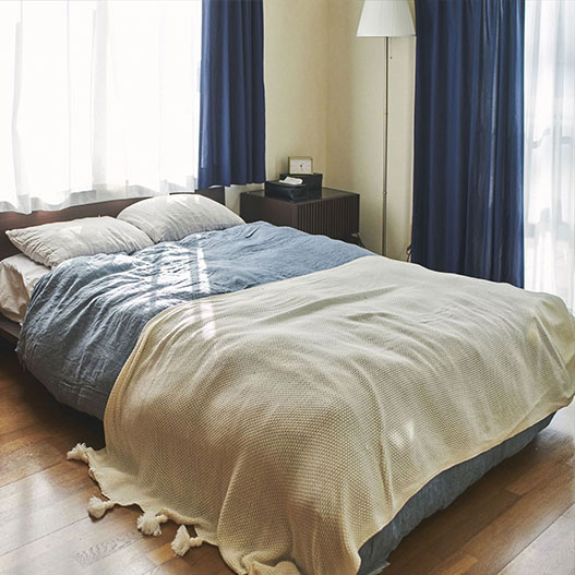 厚地はシンプルな無地の<ユーカラープレーン>を、リビングや寝室には濃い目のブラウン系家具に似合うネイビー、子供部屋は優しいアイボリーをコーディネートされています。