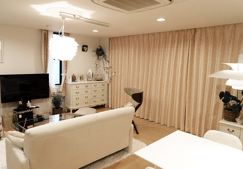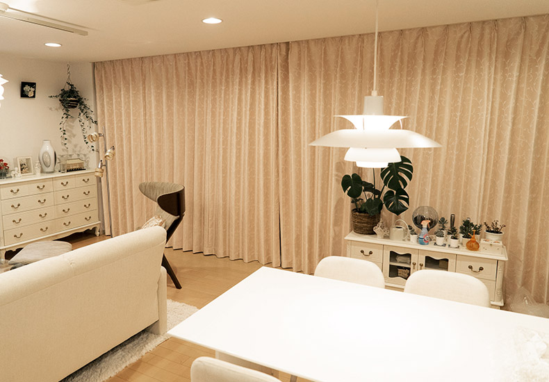 主人公が結婚していた時の部屋にはecoloシリーズの超1級遮光<ルシア ピンク>※完売商品を使用いただきました。