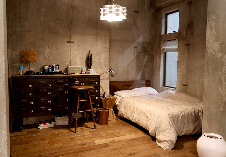 ▼ベッドルームにはカーテン<リネコ ベージュ>を使ったプレーンシェード<コード式・シングルタイプ>