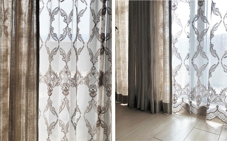 リトアニアリネンの厚地カーテンに合わせて、トルコレース『エバーラスティング』をチョイスしました。