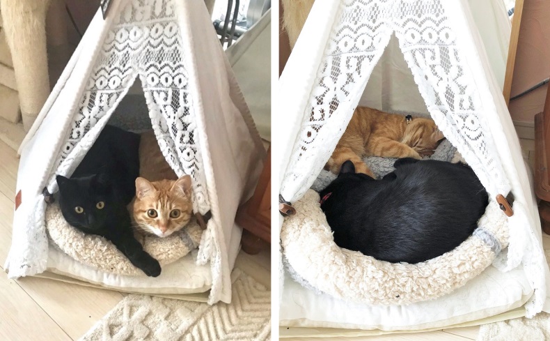 いつもココトラが愛用している猫布団をティピ―テントの中に収めてみました。