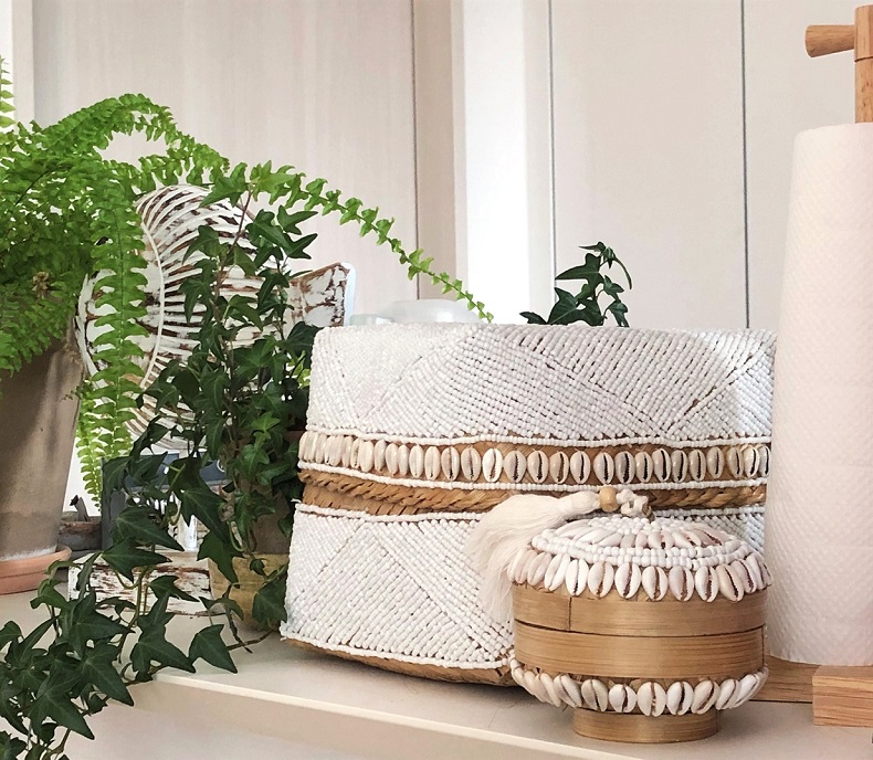 マクラメ編みのかごに本物のシェルがあしらわれているのが素敵ですよね!