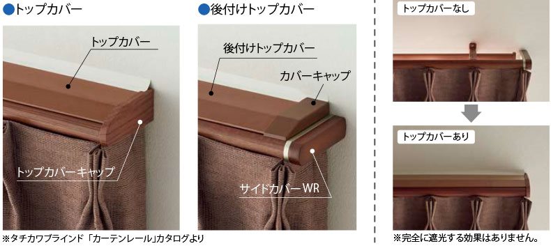 カーテンレールにトップカバー(カバートップ)を取り付けることで、レール上からの光漏れを抑えると当時に断熱性を高めます。