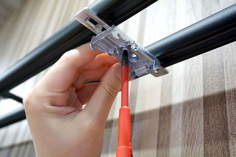 機能性レールに、カーテンレール取付金具を取付けメカものを設置できる方法です。