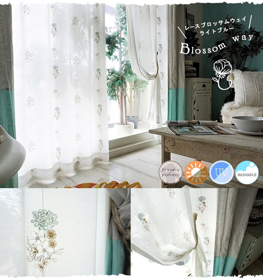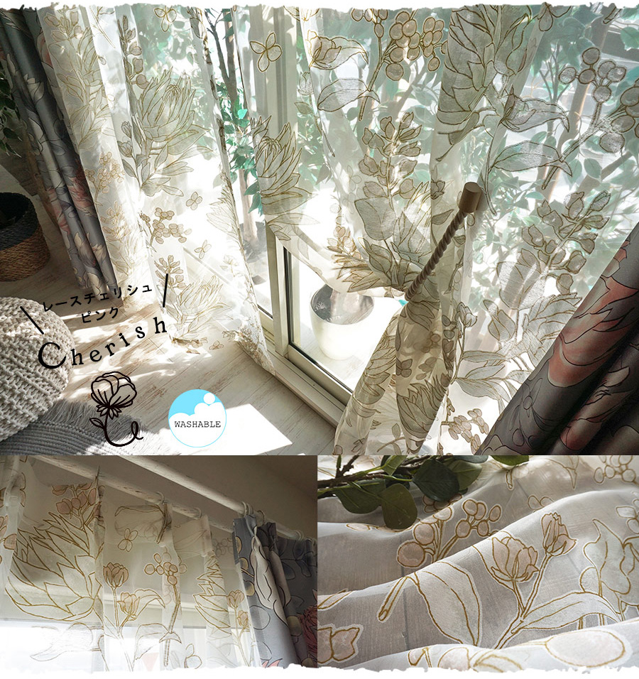 みずみずしくて可憐な草花のデザインが人気の商品です。 生命力あふれるデザインがお部屋を華やかに彩ります。こちらのレースは透明感があるので、厚地をレースの奥に掛けるフロントレースにも素敵ですよ。