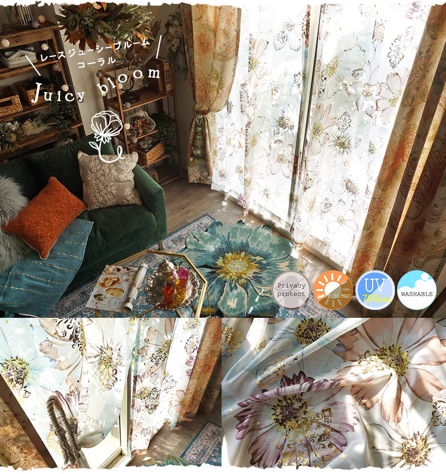 華やかさNO.1と言えるレースカーテンです。花のみずみずしい生命力を水彩風のデザインで表現しました。 さらにダマスク柄の箔プリントがきらきらしてお部屋のアクセントになります。 遮像・遮熱・UVカットなど機能性も大充実!
