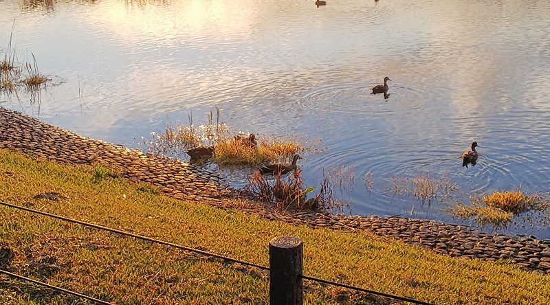 武蔵の森公園内の池にて、朝日に照らされる鴨たち。