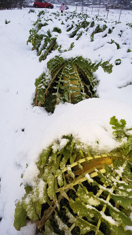 大根畑に雪が降り積もっていました。