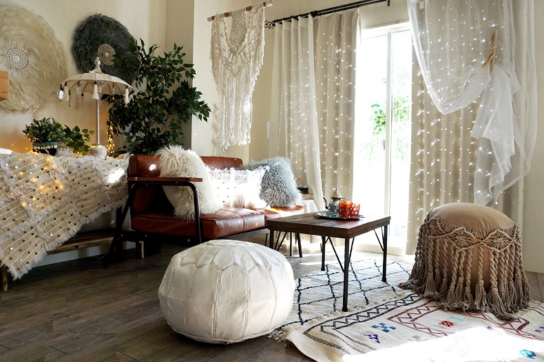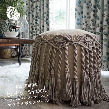 こちら、左側のラクダの革で作られた手刺繍のプフは、モロッコから。右側のマクラメ編みがまさにBOHOスタイルにピッタリのスツールはバリ島から。