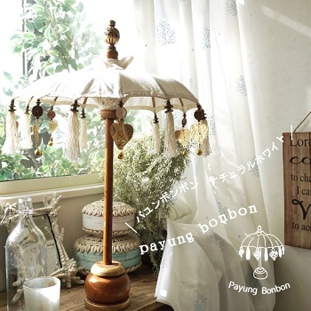 棚の上に乗っているパラソルはバリ島で職人から直接仕入れている「パユン」という日傘です。