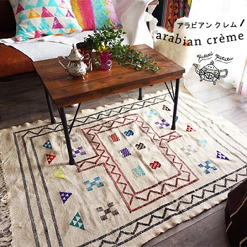 BOHOスタイルに欠かせないのはエスニックテイストのラグです。近頃では、上のお写真のように複数枚の手織りのラグを雑然と並べて遊牧民のスタイルを再現するコーディネートも人気なんですよ!