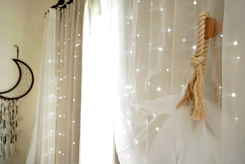 ふんわりと優しいレースカーテンにキラキラの星と月が投影されて、最高にファンタスティック!!(笑)