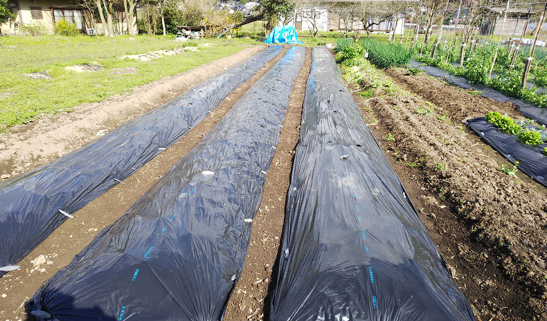 昔はビニールシートをつかったりしていなかったのですが、いまはこのやり方がベストな方法のようでビニールシートをかぶせると、雑草が生えにくくなるし、病気を防いだり、土の保温効果で発育が早くなるのだと思います。