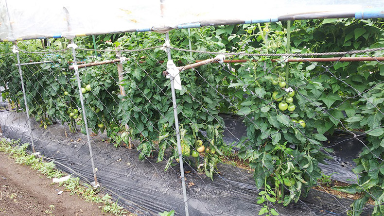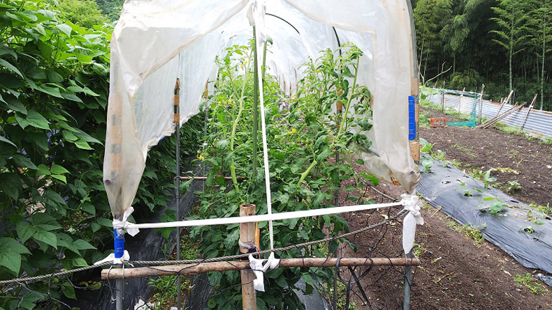 ということで、さらにトマトのまわりに網のネットを張り巡らしてきました。