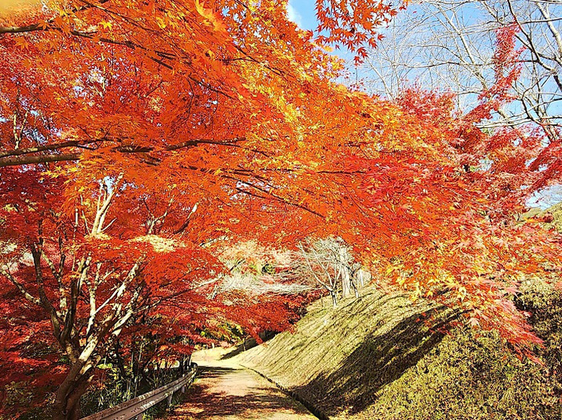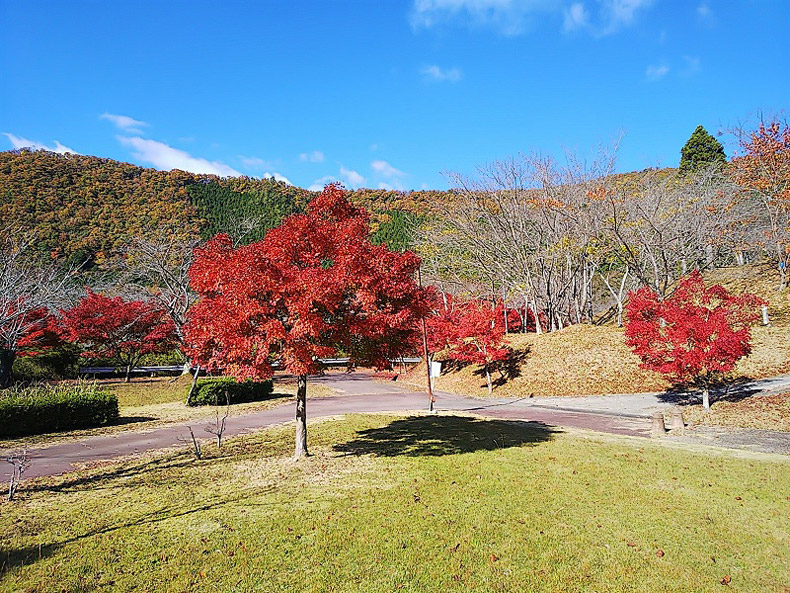 色鮮やかなもみじに囲まれながら公園内の道を通り抜けていきます。