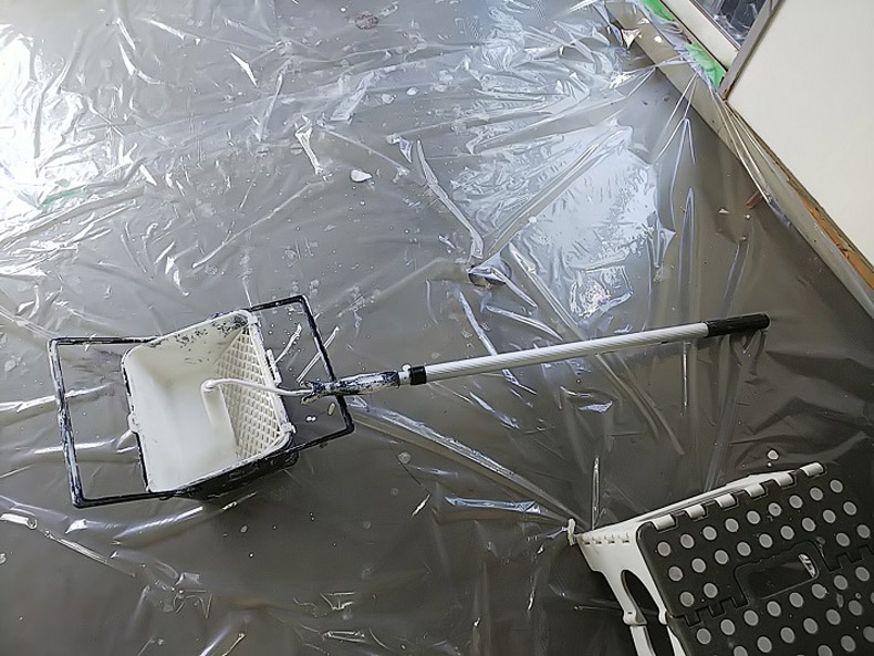ローラー刷毛に延長棒を足し、これを長めににもって、天井面に対しななめに塗るようにすると