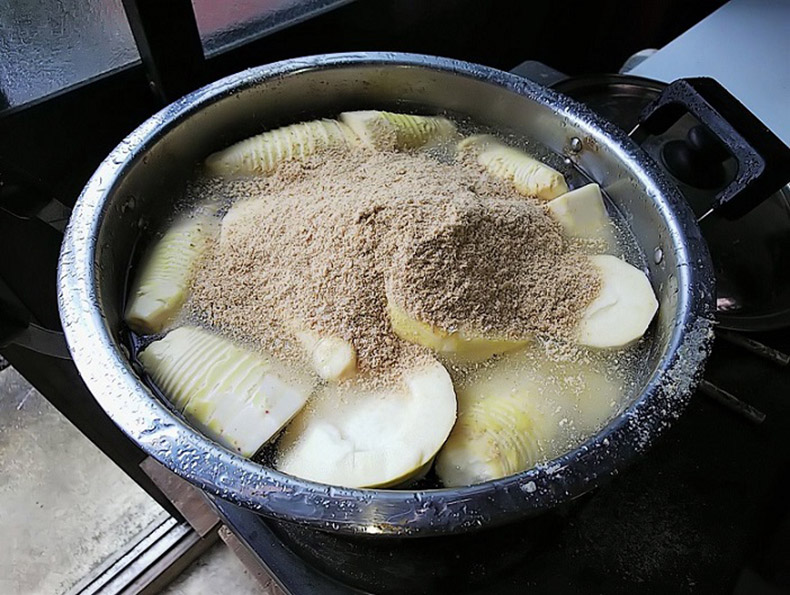 鍋に入れて、灰汁抜き用の米ぬかを加えて、煮込みます。