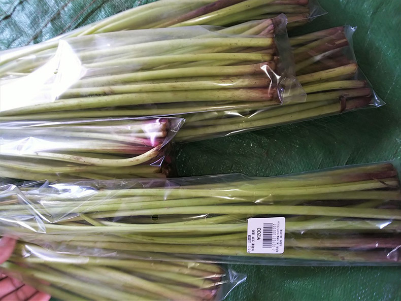 この写真は、父と母が採ったふきで、近所の野菜類を売っている店に出品するため、袋詰めにしたものです。