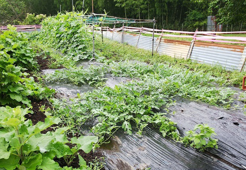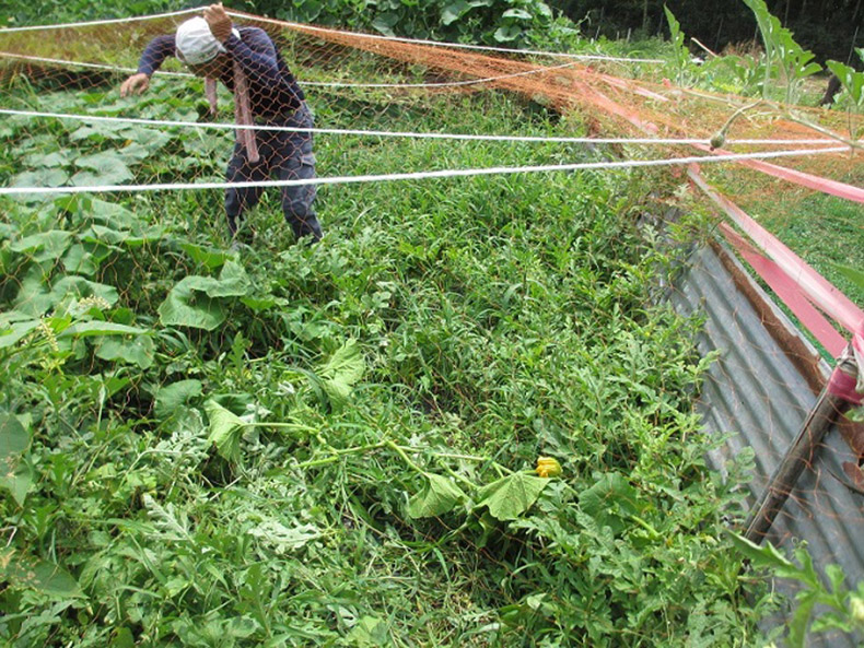 繁殖力が強くて、スイカの植えている場所に伸びてくるので、あまり伸びないように切っています。