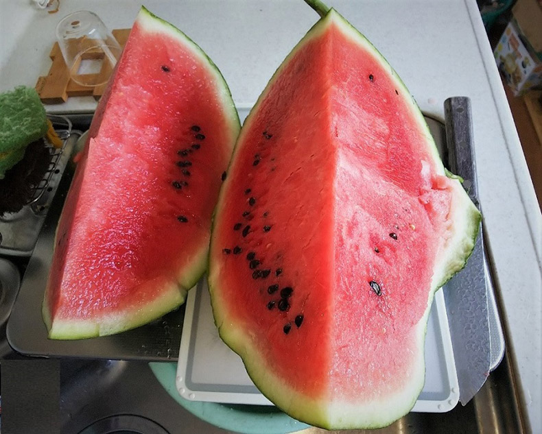 スイカはデカすぎると売れないので、大きい方の二つを家族や親せきで食べることにしました。