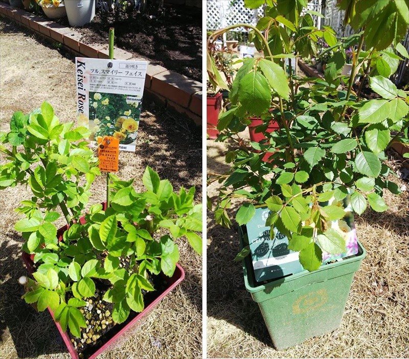 <植え付け後のスマイリーフェイス> このバラはミモザのような鮮やかな黄色の花をさかせるので期待大です。