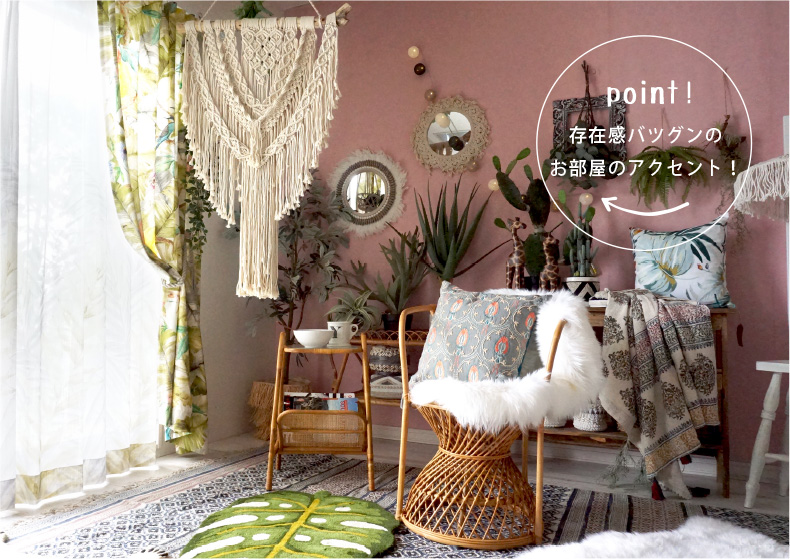 全てハンドメイドで作られたタペストリーやミラーは存在感があって、お部屋を華やかに演出してくれます。