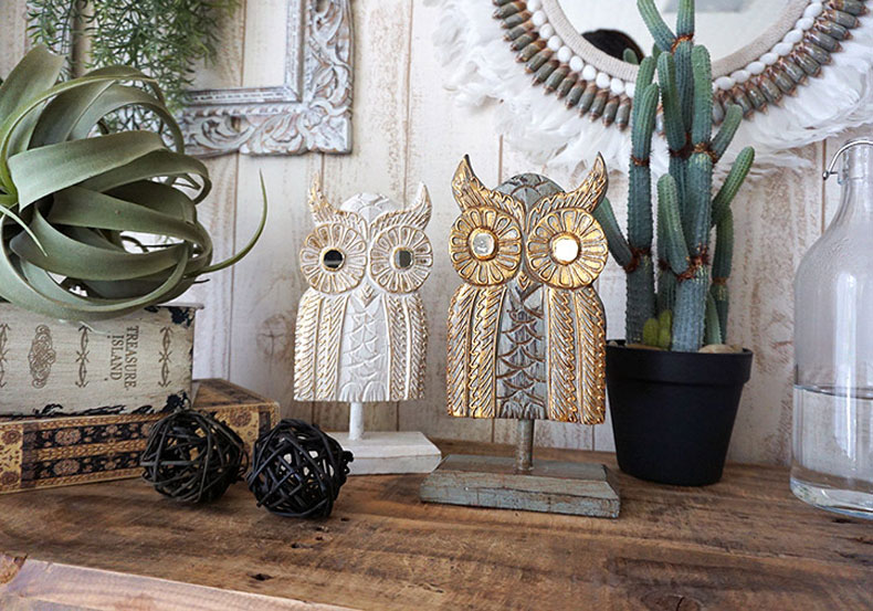 フクロウの木製オブジェ <アウル シャビーグリーン>