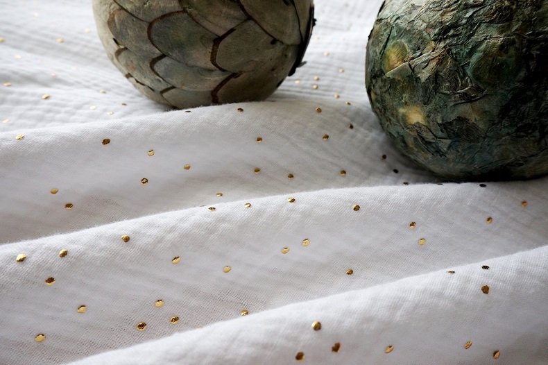 ふわっふわの二重ガーゼにゴールドのデューをたっぷりと散りばめた最高におしゃれなデザイン。