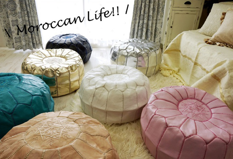 モロッコの職人による手作りのプフ。収納できるスツールとして、ご使用いただけます。