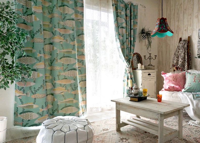 モロッコの陶器に描かれているような魚柄のカーテン<スルールグリーン>。