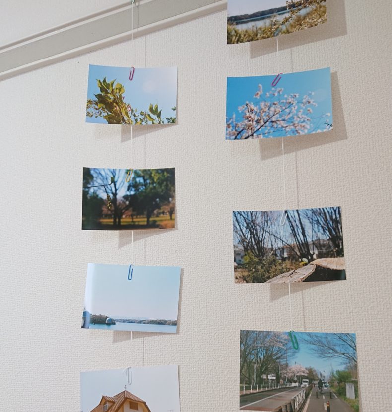 カラフルなクリップで挟んで紐で吊るすだけで気分が上がりますね!