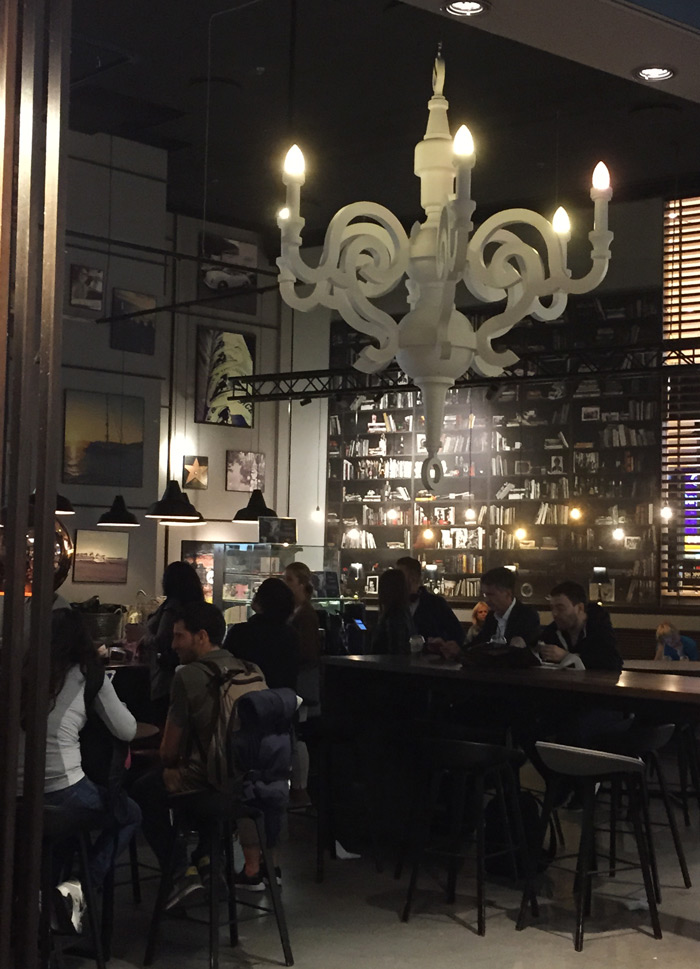 夜でもないのにこんなに暗いカフェって日本ではあまり無いように思います。ここでは照明は陰影を作り出し空間の雰囲気を演出するアイテムなのです。