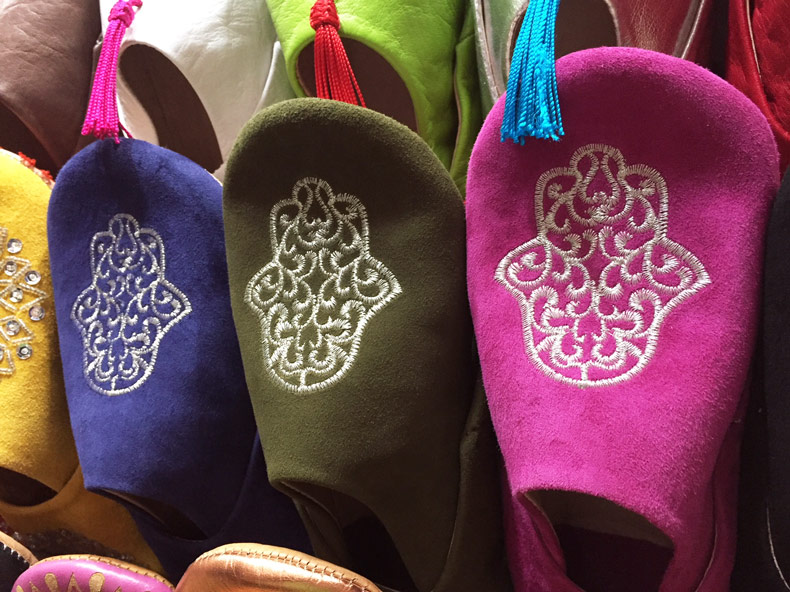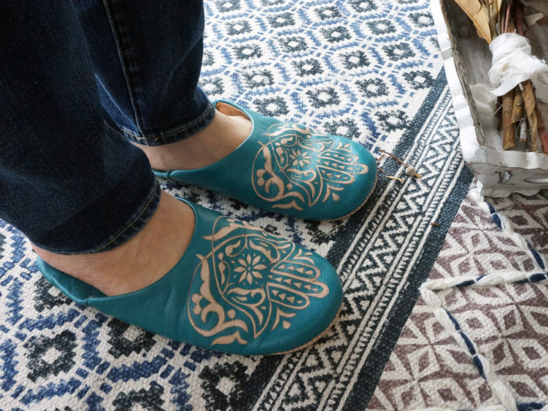 モロッコと言えば、バブーシュ!どちらもファティマの手をモチーフにしていますが写真の通りアレンジで雰囲気ががらりと変わります。