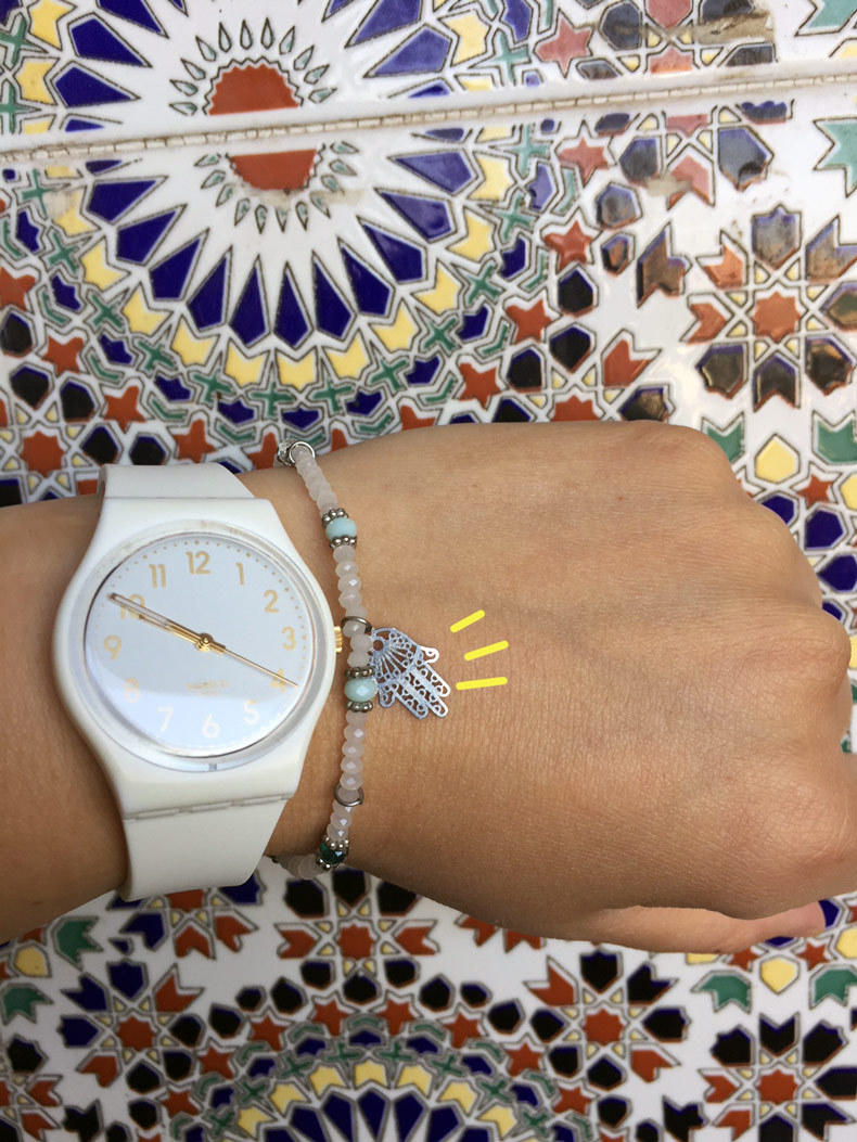 実はスタッフも現地でファティマモチーフを身につけていました。ブレスレットの先に小さなファティマの手が付いています。