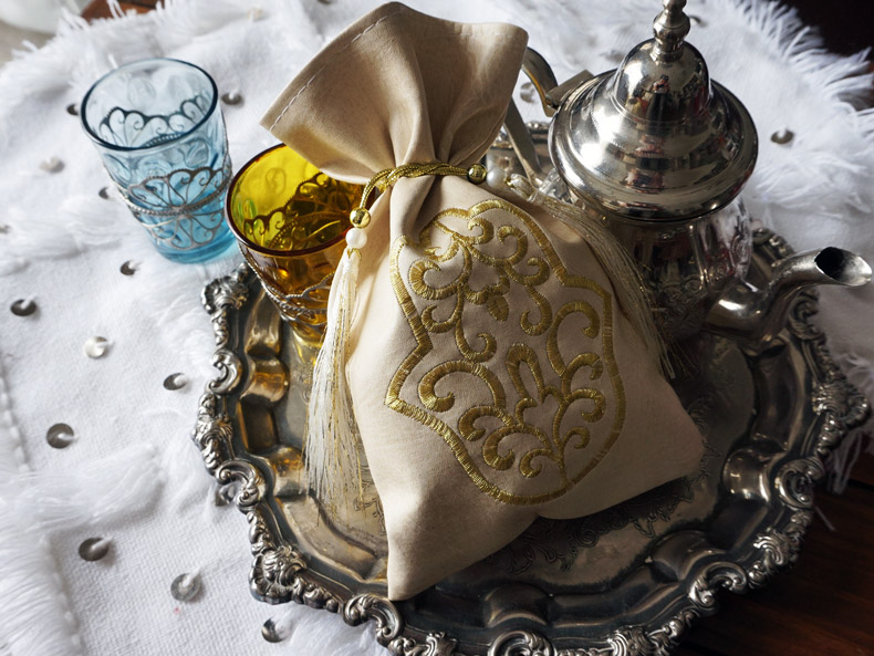 ファティマの手の刺繍入りポプリ。絶妙な色合わせがモロッコらしくて、ちょっとした棚や玄関先に飾っていただくと素敵ですよね!