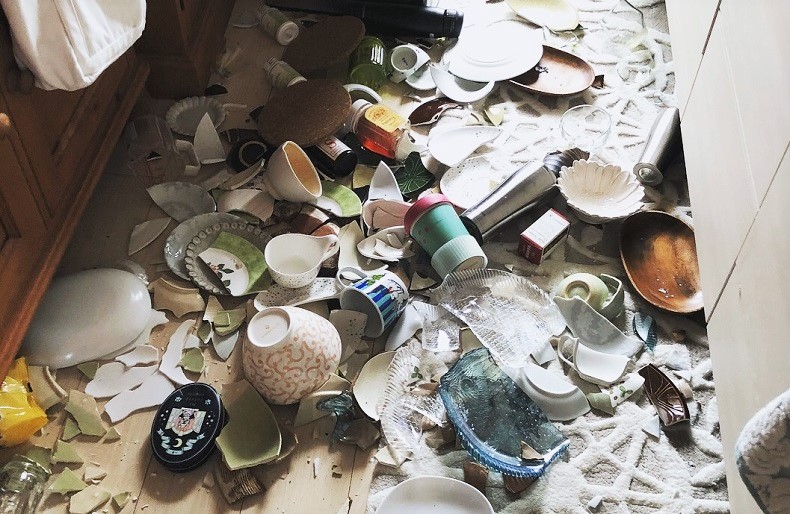ハネタンの自宅キッチン。愛用していた食器が無残な姿に・・。(春のパン祭りのオマケで頂いたお皿はなぜか無事でした・・)