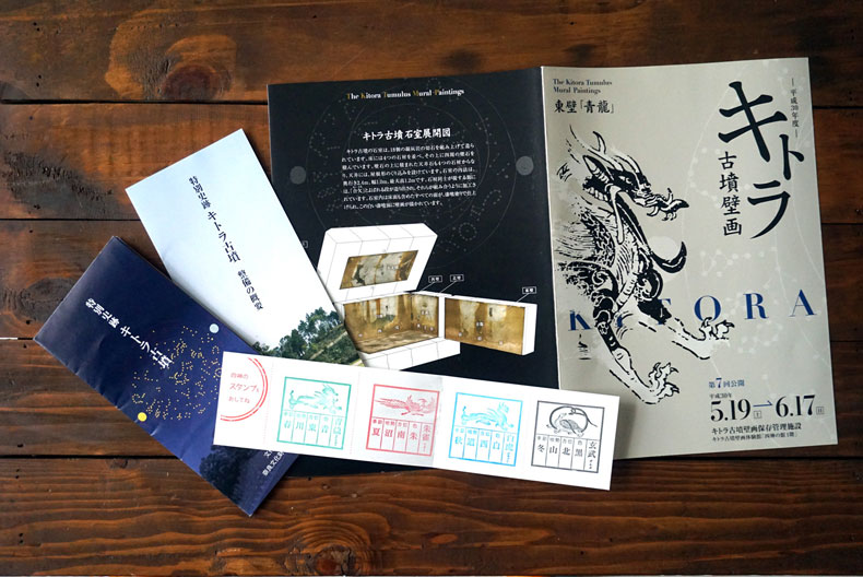 ▲パンフレットと四神の記念スタンプ。スタンプは家の四方に貼ると魔除けになるかも。