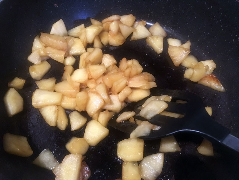 ▲バターを溶かしたフライパンでイチョウ切りにしたリンゴを炒めます。